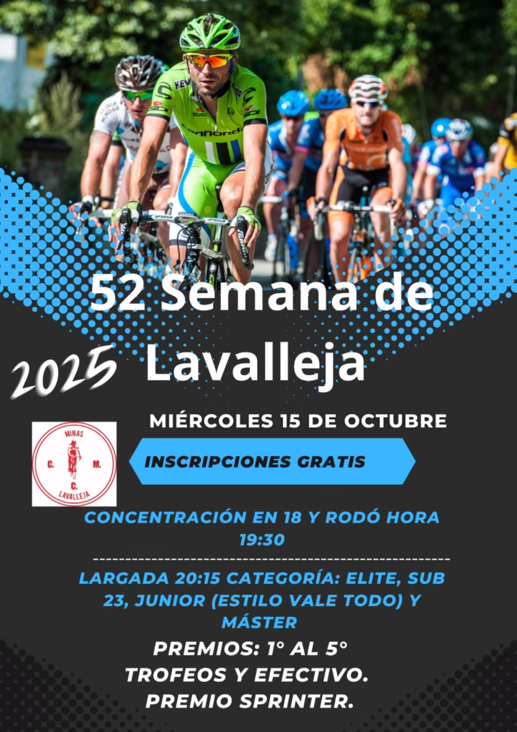 Entre el 8 y el 19 de octubre Minas vivirá la edición 52 de la Semana de Lavalleja. El Club Ciclista Minas organizará una carrera nocturna el miércoles 15 con la participación de las categorías Élite, Sub 23, Junior y Máster, en un evento gratuito que repartirá 40 mil pesos en premios.